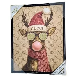 Charming Gucci reindeer Christmas framed picture. Features red scarf and gold accents. You'll love this stylish hand embellished holiday wall decor.