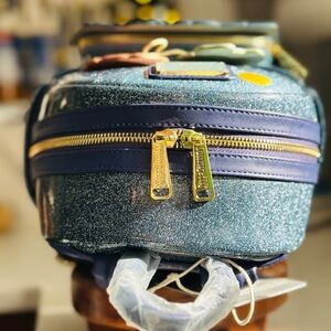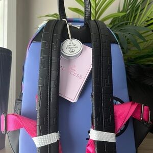 Elegant Disney backpack with stained glass design. Features a vibrant pink bow and intricate princess artwork.