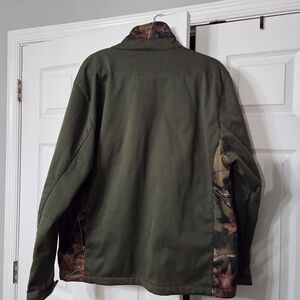 Rugged olive jacket with camo accents. Ideal for outdoor activities. Durable and stylish design.