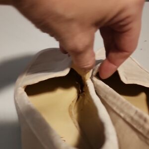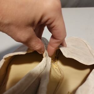 These cream flats feature a textured fabric upper, offering a refined yet casual look. The slip-on design and rounded toe ensure comfort, while the clear low heel adds a touch of modern elegance. Pics of wear on inside of shoe