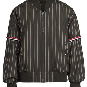 Elegant bomber jacket with vertical stripes. Features signature sleeve detail. Ideal for casual wear.