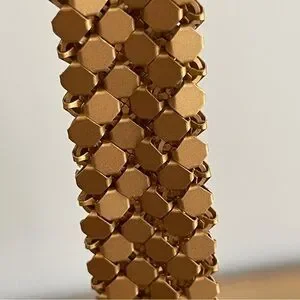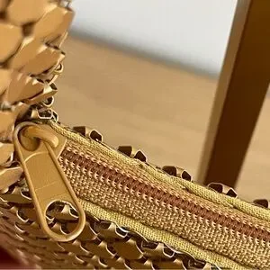 This purse is made of flat metal pieces woven together and is very unique. Has one zip pocket jnside