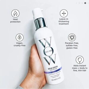 Color WOW DREAM COCKTAIL Leave in Conditioner: This leave-in treatment with heat protection is activated when you blow-dry. It features a carb-based complex (cellulose, starch, oat bran) that bonds to hair strands with heat, adding weightless mass to every hair so even fine, thin hair looks fuller and denser.