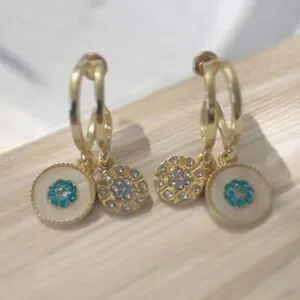 These elegant gold dangle earrings feature stunning blue accents, perfect for adding a touch of sophistication to any outfit.