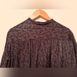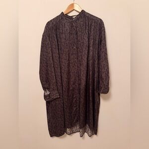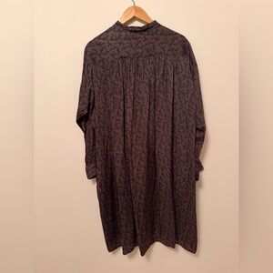 Rare Caron Callahan over-sized shirt dress in a silky grey viscose with intricate floral design in blue, tan & black.