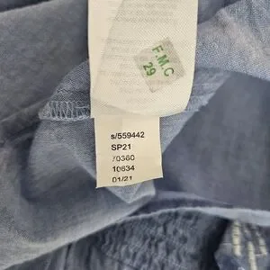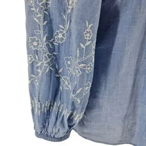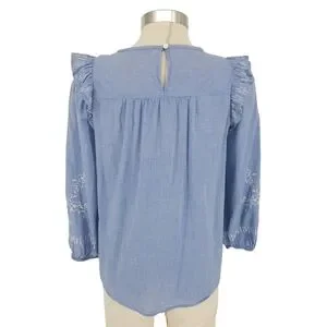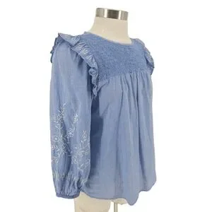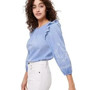 Ann Taylor LOFT Shirt Blue Floral Embroidered Ruffle Long Sleeve Smocked Medium