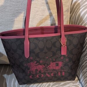 Elegant Coach Mini City Tote in Signature Brown coated canvas contrasted with Rouge leather handles and trim. The Coach horse and Sleigh logo in matching Rouge color is displayed on the front of the tote.