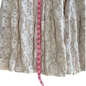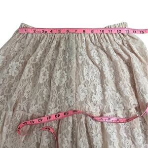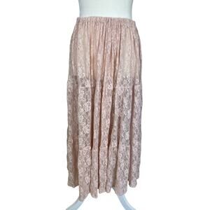 A beautiful sheer lace tiered midi skirt with an elastic waist. A blush pink color. No size tag. Waist stretches from 15 to 22 inches. Please see photos for measurements.