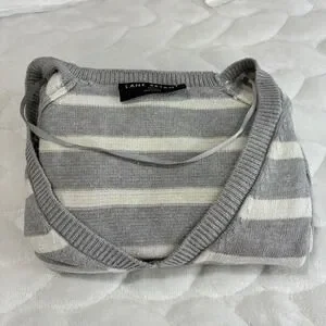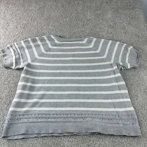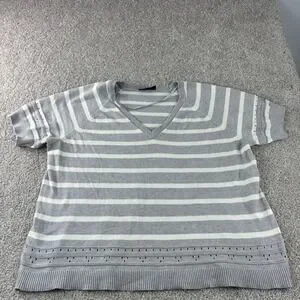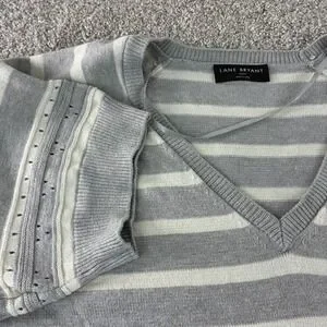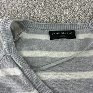Keywords: Lane Bryant, Plus Size Sweater, V-Neck Sweater, Striped Sweater, Short Sleeve Sweater, Gray Sweater, White Sweater, Women's Sweater, Knit Top, Casual Sweater, Size 22/24, Comfortable Sweater, Rayon Blend, Relaxed Fit