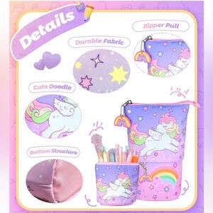Adorable unicorn telescopic pencil case perfect for back-to-school, homework stations, or gifting! This standing pencil pouch expands and folds down to become a pen holder, making it both fun and functional.