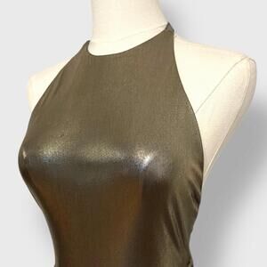 Indulge in luxury and make a statement with the Anida Dress. This stunning gown features a high neck and a twist detail, elevating its elegant design. The lame fabric shimmers in the light, while the alluring slit adds a touch of sophistication. Perfect for a special event or a night out, embrace the exclusivity of this dress. Very stretchy and comfortable, size small new with tags. **style runs slightly larger; dress fits like a 6.