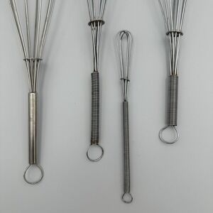 Set of 4 wire whisks. A couple of small rust spots seen but in overall good, used condition. See photos.