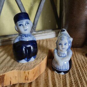 Whimsical pair of Delft Blue porcelain style salt and pepper shakers from Holland. Featuring adorable little boy and girl dressed in traditional Dutch garb. In hand-painted ceramic, it shows beautiful cobalt-blue details on a white background. Inscribed “BLAUW” underneath.