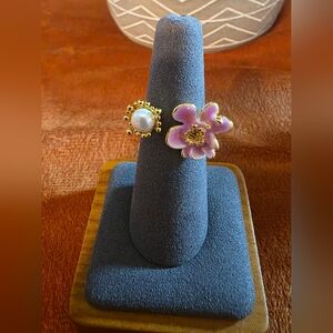 Elegant pink and gold ring featuring a delicate floral design with a pearl accent. Perfect for adding a touch of sophistication to any outfit. Nwbox