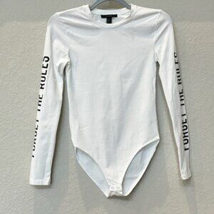 NWOT "FORGET THE RULES" Fitted Very Soft Bodysuit Top, Forever 21 White Bodysuits, Long Sleeve Graphic Body Suit , Women's Tees Tops, Cozy Loungewear