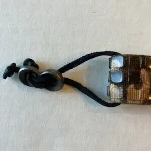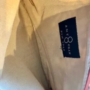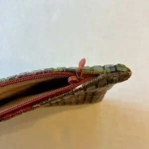 Amy Chan NY wristlet in soft olive green, brown, peachy reds and beige sequin like material. Zippered closure. Perfect to hold the essentials: cell, cards, sunglasses and keys.