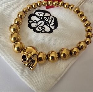 Features: unisex, elasticized, slip-on, graduated beads with single engraved skull motif bead