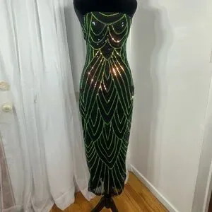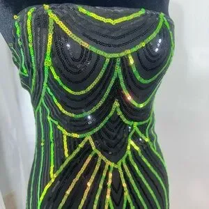 Shine in this stunning black and green sequin dress. Perfect for evening events, this dress offers a glamorous look with its intricate design.