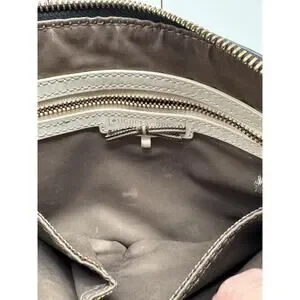 Pre-owned bag with light creasing to leather and mild rubbing at corners and edges. Gold-tone hardware and hangtag show surface scratches and slight finish wear. Interior fabric lining has small marks and lint from use; zipper and strap attachments are secure and functional, dust bag not included.