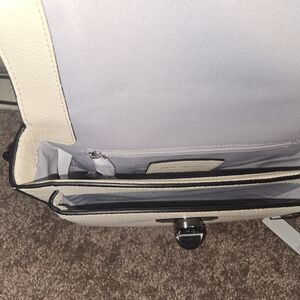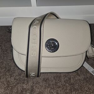 This crossbody bag is crafted from pebbled leather and features a distinctive turnlock closure with a signature logo medallion. It typically includes a removable and adjustable webbing strap, often featuring a bold logo design.