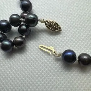 The Vintage Tahitian Peacock Rainbow Black Pearl Necklace features a stunning 14K gold clasp and an 18-inch beaded style. The necklace is embellished with multicolor Tahitian pearls and yellow gold clasp, making it a unique and elegant piece of fine jewelry. The black Tahitian pearls add a touch of sophistication, while the peacock rainbow design adds a playful and eye-catching element to the overall look. Perfect for adding a pop of color to any outfit, this necklace is sure to make a statement. See pictures closely because this is the exact item I will be sending you.