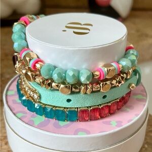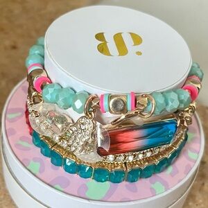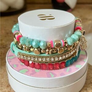 Enhance your style with this vibrant bracelet set featuring rose gold, blue, and pink beads. Perfect for any occasion. Retro & Hard To Find Stack! Brand new in original box