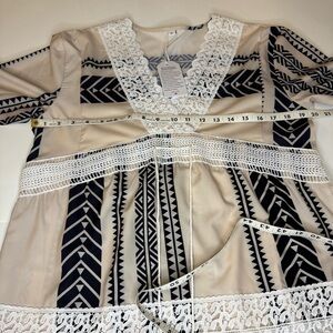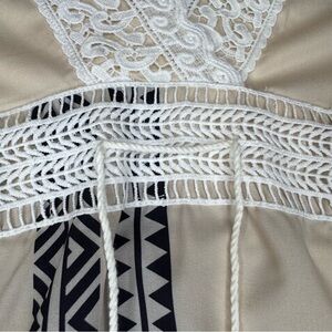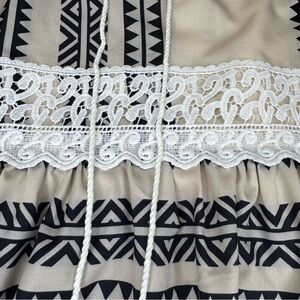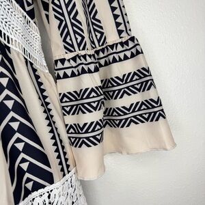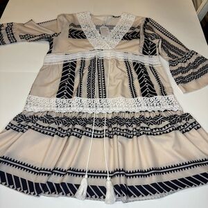 Stylish boho dress featuring cream and black patterns. Accentuated with lace details for a chic look. Front tie, for style only with cute tassels gorgeous bohemian style with interesting patterns and lace, bell sleeves. Coastal Cowgirl Western Bohemian Oversized Cozy