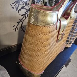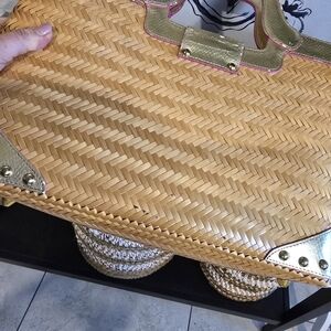 Stylish woven tote bag featuring a chic gold trim. Perfect for any occasion.