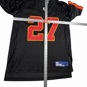 The product is a Reebok Larry Johnson #27 Jersey in size L for men. It is officially licensed by the National Football League (NFL) and features the colors black and green, representing the Kansas City Chiefs. The jersey is designed for the regular season and is perfect for fans looking to show their support for the team during NFL events or tournaments. Made from mesh material, this jersey is a must-have for any fan of the Kansas City Chiefs and Larry Johnson.