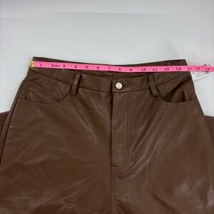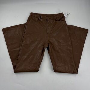 Chic brown faux leather pants with a sleek flare. Ideal for a trendy outfit.
