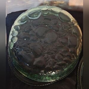 Elegant green glass oven-proof baking dish with matching lid. Perfect for serving and baking. This vintage baking dish is a part of the "Orchard Fruit" collection. It features an embossed fruit pattern on the lid, and the bottom, smooth on the inside. The matching lid doubles as a 9" pie plate, or baking dish. The larger dish has a 3-quart capacity. Heavy, sturdy glass. There are no chips, cracks, or other damage. The bottom is 9 1/2" across, approximately 3" deep. The top is 9" across, approximately 1 3/4" deep. I also offer a Libbey "Orchard Fruit" baking dish.