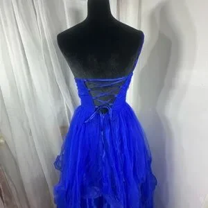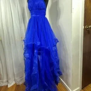 Stunning one-shoulder gown in royal blue. Features a flowing, layered skirt for a dramatic look.