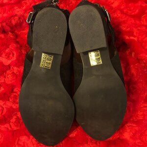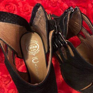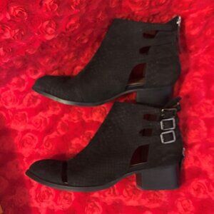 These boots are beautifully made. Soft reptile pattern suede. The sides are open with 3 straps and 3 silver buckles. There is also a short slit on either side by the toe of the bootie. The heel is 1 1/2 inches high and the rear sipper is 4 inches from top to bottom.