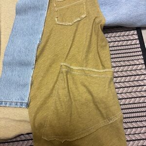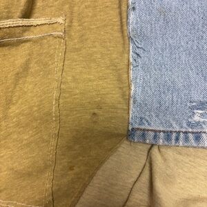 Unique patchwork open-front jacket/top featuring a mixed cotton and light wash denim design with raw hems and distressed details. Oversized, relaxed fit with front pockets and statement contrast paneling. Boho, artsy, cottagecore vibe.