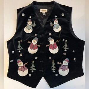 Talbots Women’s Vintage Black Velvet Snowman Vest M Petite Holiday Christmas