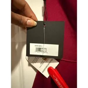 This is a new with tags women's Mac Duggal one-shoulder dress in burgundy, size 4. The dress features a fitted bodice and a high-low skirt with cascading ruffles along one side, creating a dramatic slit. The fabric appears to be a smooth, possibly stretch, material. The back of the dress is solid burgundy with a subtle seam at the waist. The garment tag confirms "IEENA for MAC DUGGAL" and "MADE IN CHINA."