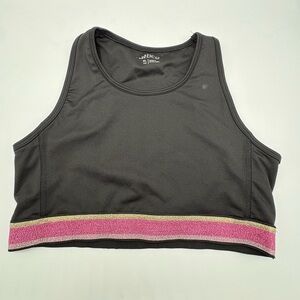 Stylish black sports bra with pink and gold stripes