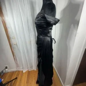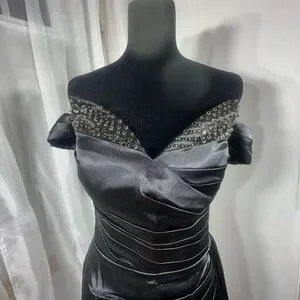 Step into elegance with this stunning black strapless off the shoulder gown, perfect for any formal occasion.