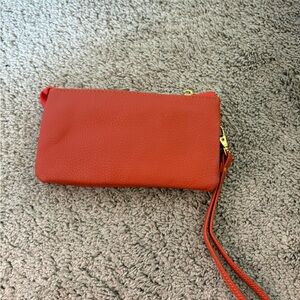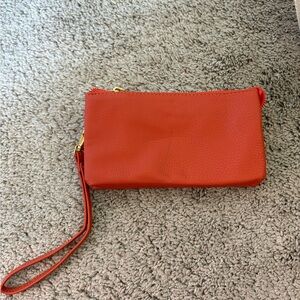 Elevate your style with this chic orange wristlet clutch. Perfect for adding a pop of color to any outfit.