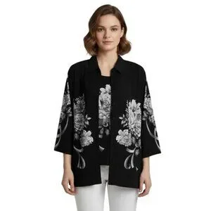 ModeLia Women's Floral Print Kimono With Inner Sleeveless Blouse Black Size Medium