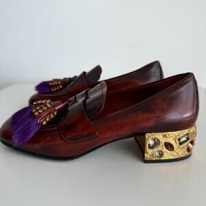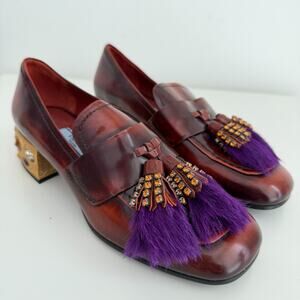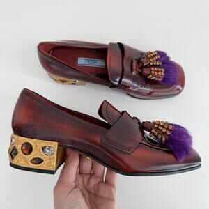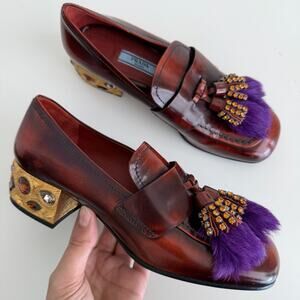 Prada Penny Loafers Shoes Womens 35.5 EU Leather Embellished Heeled Fur Tasseled