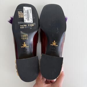Chic and statement Prada penny loafers in rich oxblood leather with bold embellished block heels and eye-catching purple fur tassel details. A classic menswear silhouette with Prada’s signature playful, runway-inspired twist.