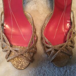 Kate Spade gold metallic stiletto heel sandals. These heels have ankle straps and are in gently used condition.