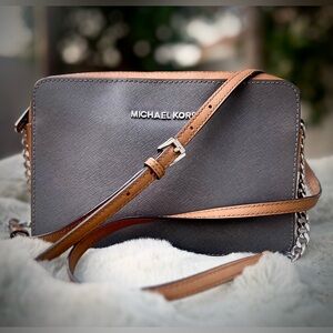 Michael Kors Jet Set Charcoal Gray and Tan Crossbody Bag
