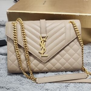 Chic Yves Saint Laurent bag with quilted leather. Features elegant gold chain strap and iconic logo. Perfect for stylish outings.