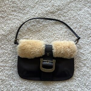 UGG bag, shearling purse, cozy clutch, winter handbag, mini leather purse, shearling trim bag, brown leather clutch, fall accessory, small shoulder bag, winter fashion bag, 70s style