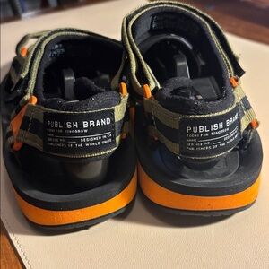 Durable sandals with a black base and green straps. Ideal for active play. See pictures G2