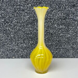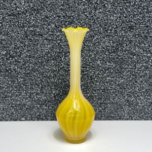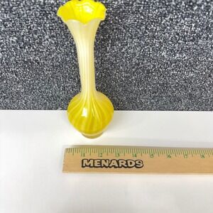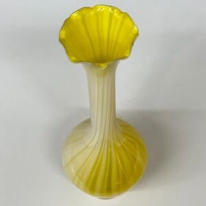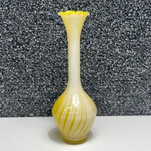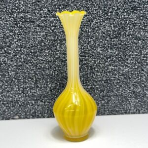 Vintage hand-blown glass bud vase showcases a vibrant yellow and white swirl pattern, often referred to as a "pulled feather" or "onion skin" design. This elegant piece features a long, slender neck that transitions into a ruffled, scalloped rim, adding a touch of delicate detail. The bulbous base provides stability while highlighting the intricate color transitions of the glass. Perfect for displaying a single stem or as a standalone decorative accent, this vase brings a bright, mid-century modern aesthetic to any shelf or tabletop. The smooth, polished bottom indicates quality craftsmanship.