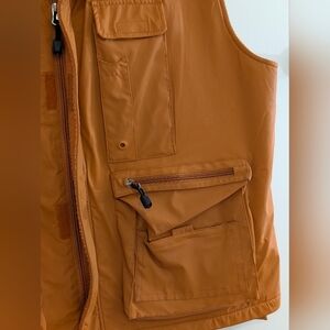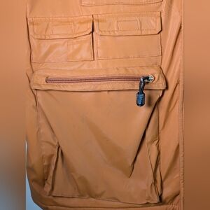 Rugged multi-pocket utility vest by Common Man in a versatile brown tone. Classic outdoorsman styling with a fleece lined collar, durable polyurethane shell, and functional storage throughout. Features multiple flap pockets, zip compartments, and large cargo areas perfect for fishing gear, tools, travel, or everyday carry.