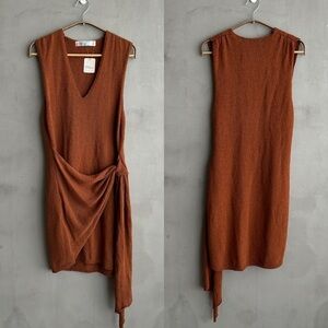 An asymmetrical wrap detailing lends a touch of signature style to this light-brown Free People mini dress, which features a classic figure-skimming silhouette.
